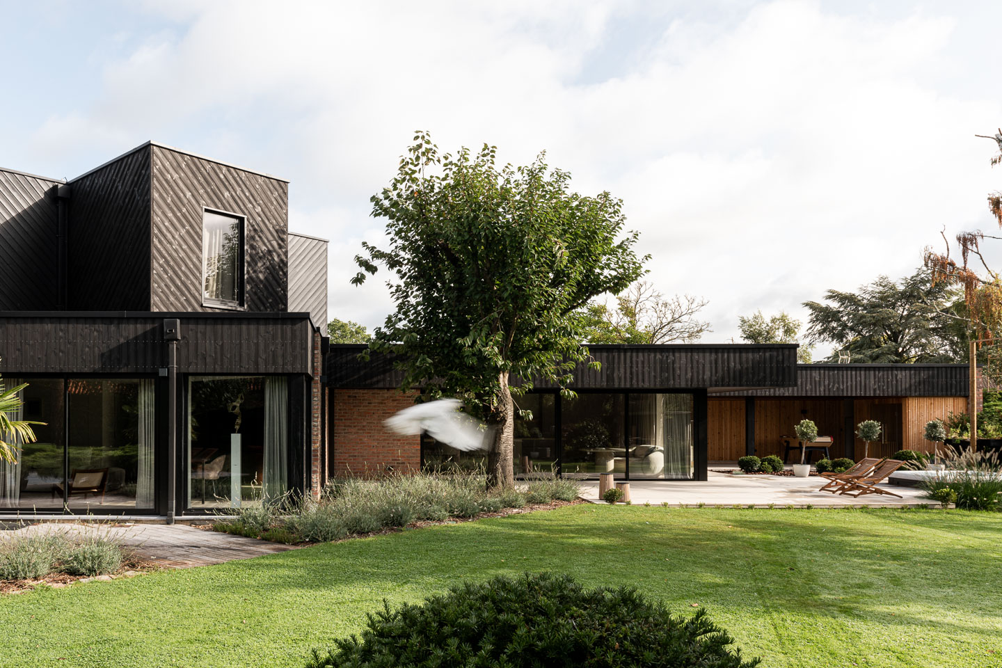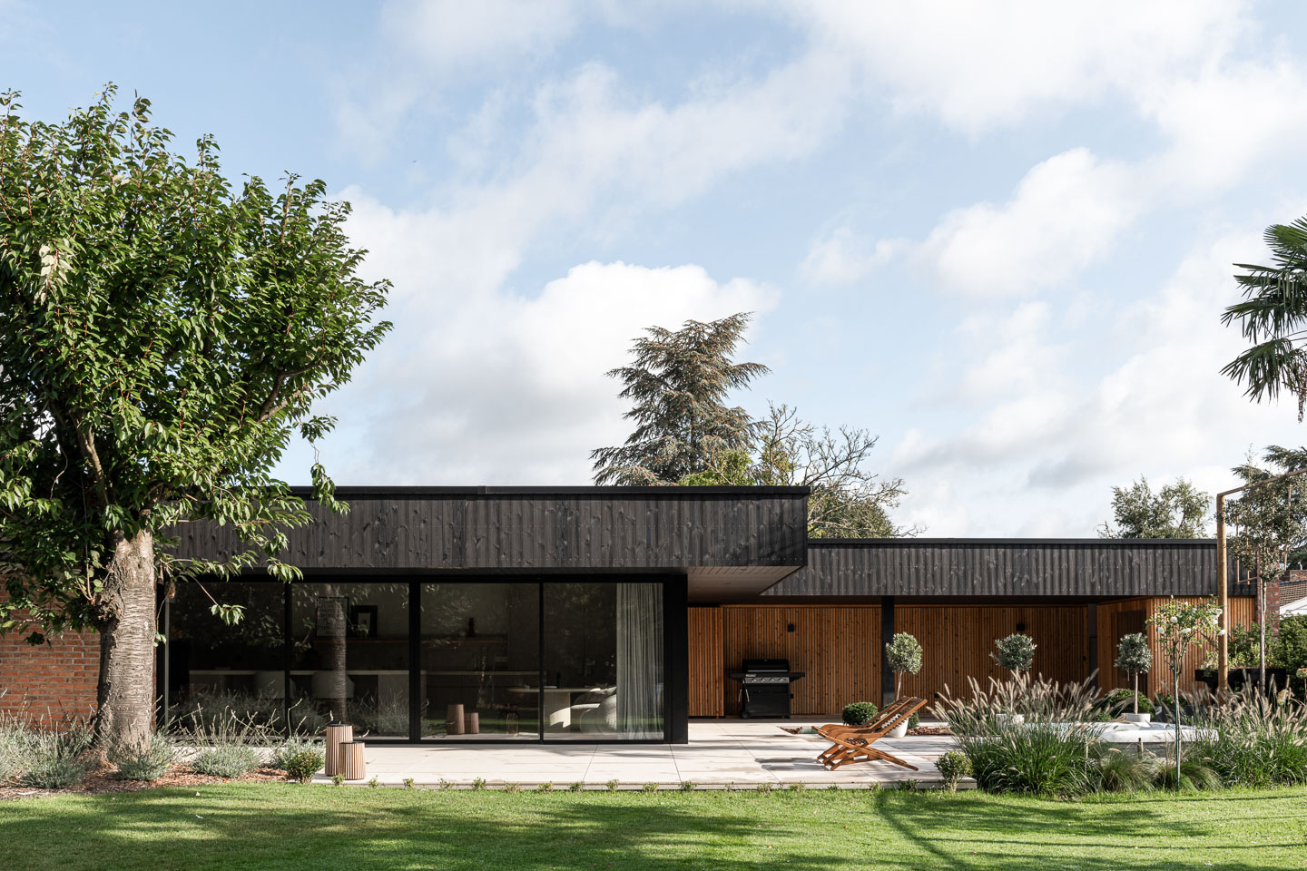 Cette réalisation mêle bardage bois brûlé, brique pleine et aluminium noir mat pour créer un ensemble contemporain, à la fois sobre et puissant.
